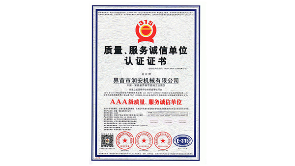 質(zhì)量、服務(wù)誠信單位認(rèn)證證書公司已通過了ISO9001質(zhì)量管理認(rèn)證、ISO14001環(huán)境管理體系認(rèn)證和ISO45001職業(yè)健康安全管理體系認(rèn)證。為中國儲備糧管理總公司糧機(jī)設(shè)備的A級供應(yīng)商、安徽省高新技術(shù)企業(yè)、擁有阜陽市企業(yè)技術(shù)中心。