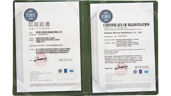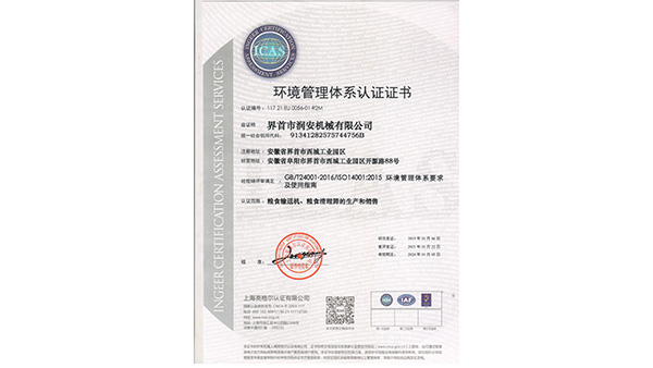 環(huán)境體系公司已通過了ISO9001質(zhì)量管理認(rèn)證、ISO14001環(huán)境管理體系認(rèn)證和ISO45001職業(yè)健康安全管理體系認(rèn)證。為中國儲備糧管理總公司糧機(jī)設(shè)備的A級供應(yīng)商、安徽省高新技術(shù)企業(yè)、擁有阜陽市企業(yè)技術(shù)中心。