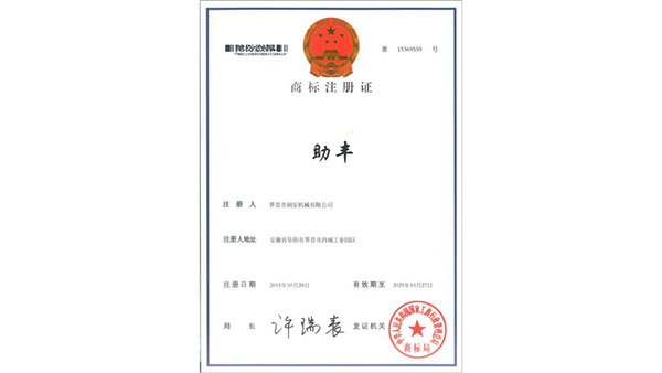 商標(biāo)注冊證書公司已通過了ISO9001質(zhì)量管理認(rèn)證、ISO14001環(huán)境管理體系認(rèn)證和ISO45001職業(yè)健康安全管理體系認(rèn)證。為中國儲備糧管理總公司糧機(jī)設(shè)備的A級供應(yīng)商、安徽省高新技術(shù)企業(yè)、擁有阜陽市企業(yè)技術(shù)中心。