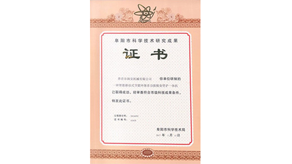 科技成果證書公司已通過了ISO9001質(zhì)量管理認(rèn)證、ISO14001環(huán)境管理體系認(rèn)證和ISO45001職業(yè)健康安全管理體系認(rèn)證。為中國儲備糧管理總公司糧機(jī)設(shè)備的A級供應(yīng)商、安徽省高新技術(shù)企業(yè)、擁有阜陽市企業(yè)技術(shù)中心。
