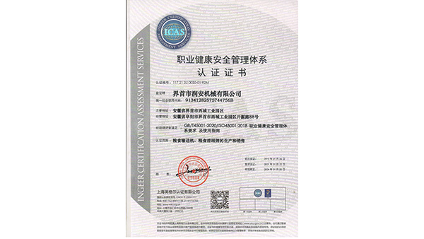 職業(yè)健康體系公司已通過了ISO9001質(zhì)量管理認(rèn)證、ISO14001環(huán)境管理體系認(rèn)證和ISO45001職業(yè)健康安全管理體系認(rèn)證。為中國儲備糧管理總公司糧機(jī)設(shè)備的A級供應(yīng)商、安徽省高新技術(shù)企業(yè)、擁有阜陽市企業(yè)技術(shù)中心。