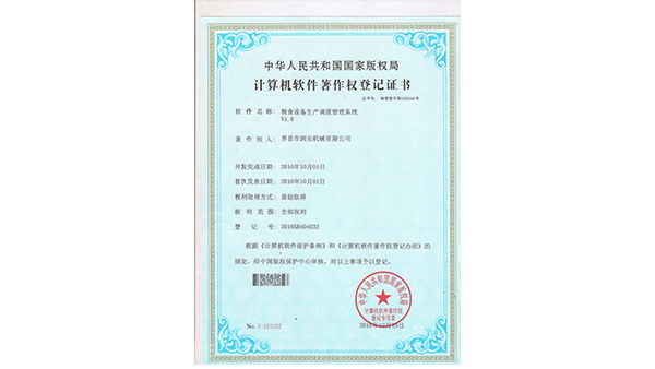 著作登記公司已通過了ISO9001質(zhì)量管理認(rèn)證、ISO14001環(huán)境管理體系認(rèn)證和ISO45001職業(yè)健康安全管理體系認(rèn)證。為中國儲備糧管理總公司糧機(jī)設(shè)備的A級供應(yīng)商、安徽省高新技術(shù)企業(yè)、擁有阜陽市企業(yè)技術(shù)中心。